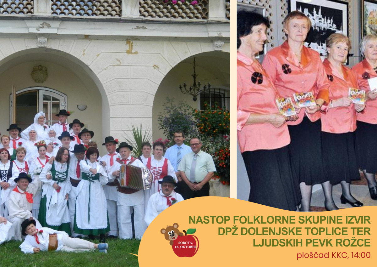 V soboto, 18. oktobra, ob 14. uri bo na ploščadi pred KKC nastopila folklorna skupina Izvir DPŽ Dolenjske Toplice skupaj z ljudskimi pevkam Rožce.