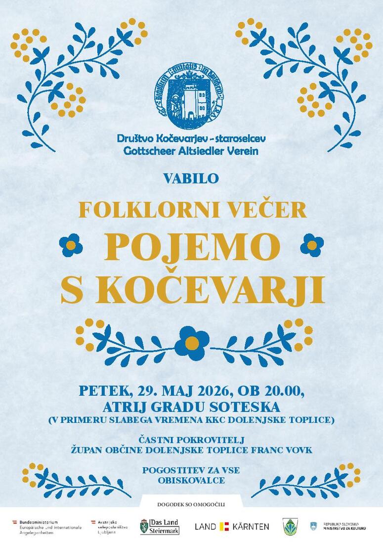 Vabljeni na folklorni večer Pojemo s Kočevarji, ki bo v petek, 29. maja 2026, ob 20. uri v atriju prenovjenega gradu Soteska. Kulturnemu programu bo sledila pogostitev za vse obiskovalce. Častni pokrovitelj je župan občine Dolenjske Toplice, Franc Vovk.