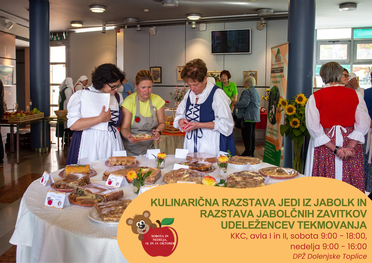 Društvo podeželskih žena Dolenjske Toplice vas vabi na kulinarično razstavo jedi iz jabolk ter na razstavo jabolčnih zavitkov udeležencev tekmovanja.