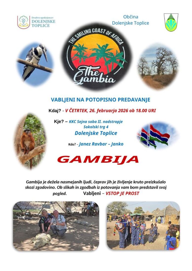 Vabljeni na zanimivo potopisno predavanje, kjer vas bo Janez Ravbar - Janko popeljal v Gambijo, deželo prijaznih ljudi, bogate narave in edinstvenih zgodb. S fotografijami in doživetji iz poti boste spoznali vsakdan, kulturo ter lepote te zahodnoafriške države.