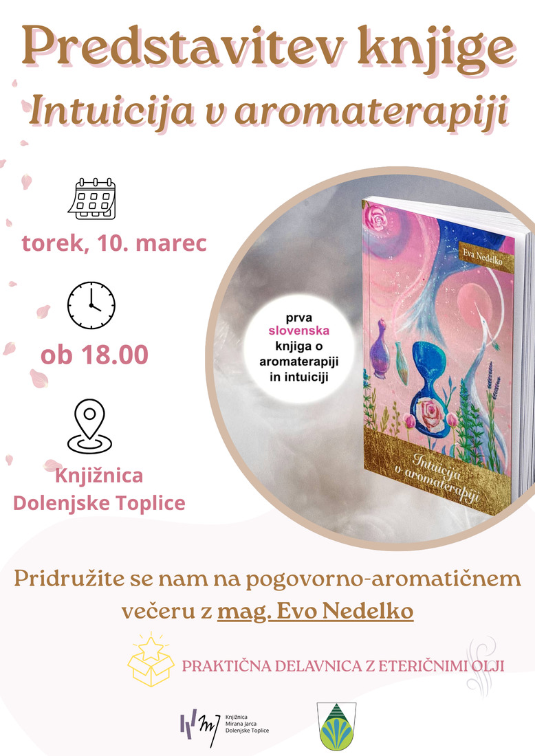 Avtorica vas bo popeljala v čaroben preplet intuicije in aromaterapije – dveh poti, ki sta zaznamovali njeno življenjsko in strokovno pot. Spregovorila bo o nastanku knjige, o tem, komu je namenjena in zakaj njena sporočila lahko nagovorijo prav vsakogar med nami. Posebno doživetje pa bo tudi srečanje z dišečimi eteričnimi olji, ki jih boste zaznali z lastnim nosom ter občutili njihov globok vpliv na možgane in počutje.