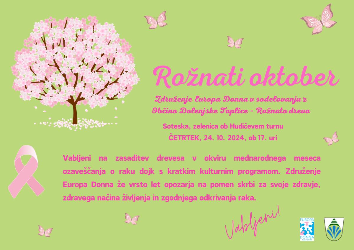 V Združenju Europa Donna Slovenija vas tudi letos z veseljem vabimo, da se pridružite našim dejavnostim v okviru rožnatega oktobra. mednarodnega meseca osveščanja o raku dojk. S skupnimi močmi lahko poskrbimo, da bo čim več ljudi prepoznalo, kako pomembna sta zdrav način življenja in zgodnje odkrivanje te bolezni. Rak dojk je žal še vedno ena najpogostejših oblik raka pri ženskah, zbolevajo pa tudi moški. V Sloveniji se vsako leto s to diagnozo sooči okoli 1500 žensk in do 15 moških. Dobra novica pa je, da je rak dojk zelo dobro ozdravljiv, če ga odkrijemo dovolj zgodaj. Prav zgodnje odkrivanje in vsakemu posamezniku prilagojeno zdravljenje sta ključna, da se umrljivost vztrajno zmanjšuje. S skupnim močmi lahko dosežemo, da bo naša sporočila slišalo čim več ljudi.