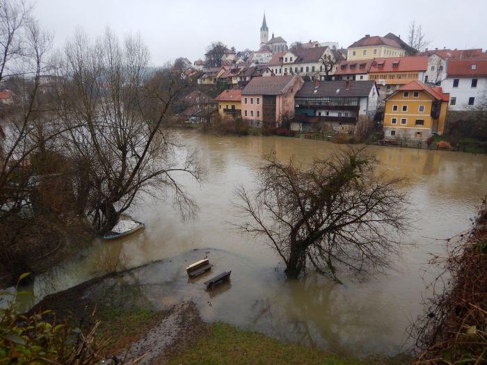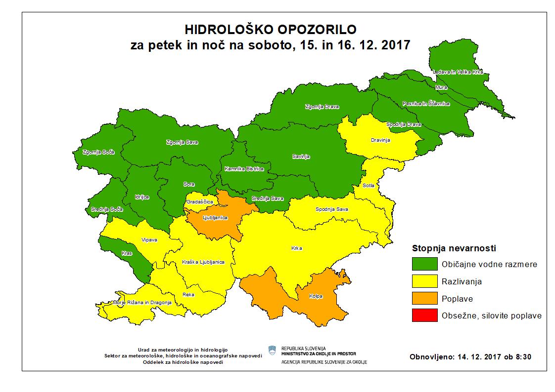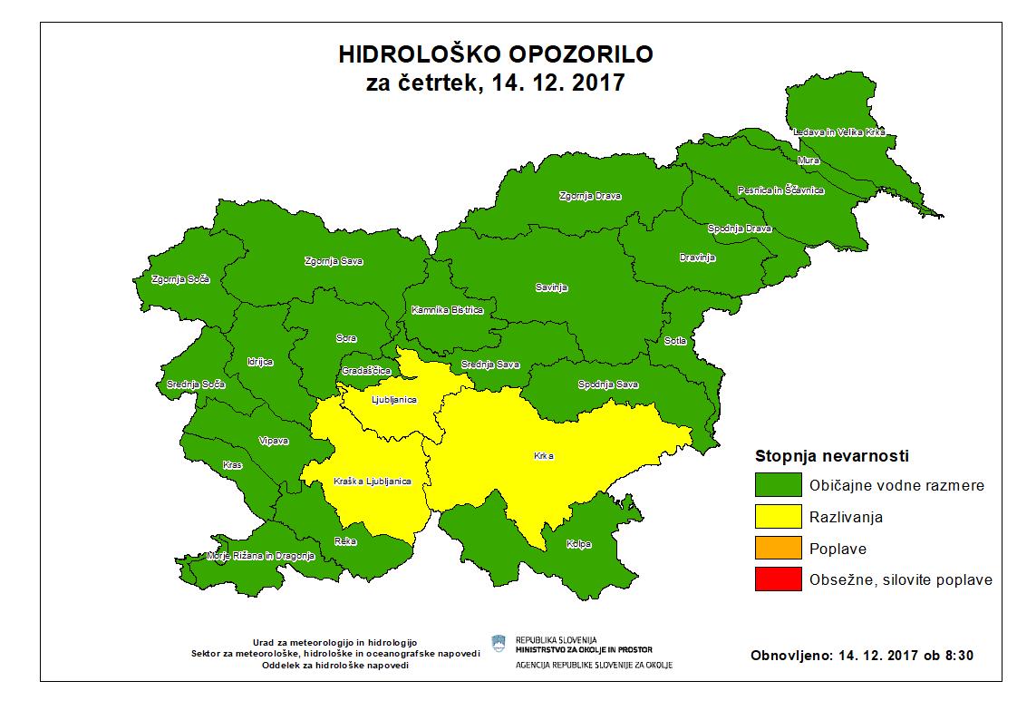 Reka Krka se razliva na območjih pogostih poplav, njen pretok prehodno upada. Območja razlivanj se bodo danes prehodno zmanjševala, v petek popoldne pa se bodo ponovno začela povečevati. Ljubljanica poplavlja na Ljubljanskem barju. Poplavljene površine se bodo v petek in soboto ponovno povečevale. V petek dopoldne bo hitreje narasla reka Kolpa in pričela poplavljati. Gladine ojezeritev kraških polj na Notranjskem in Dolenjskem se bodo v prihodnjih dneh še zviševale. V petek in noči na soboto so možna razlivanja tudi drugih rek v južni, osrednji in vzhodni Sloveniji.
