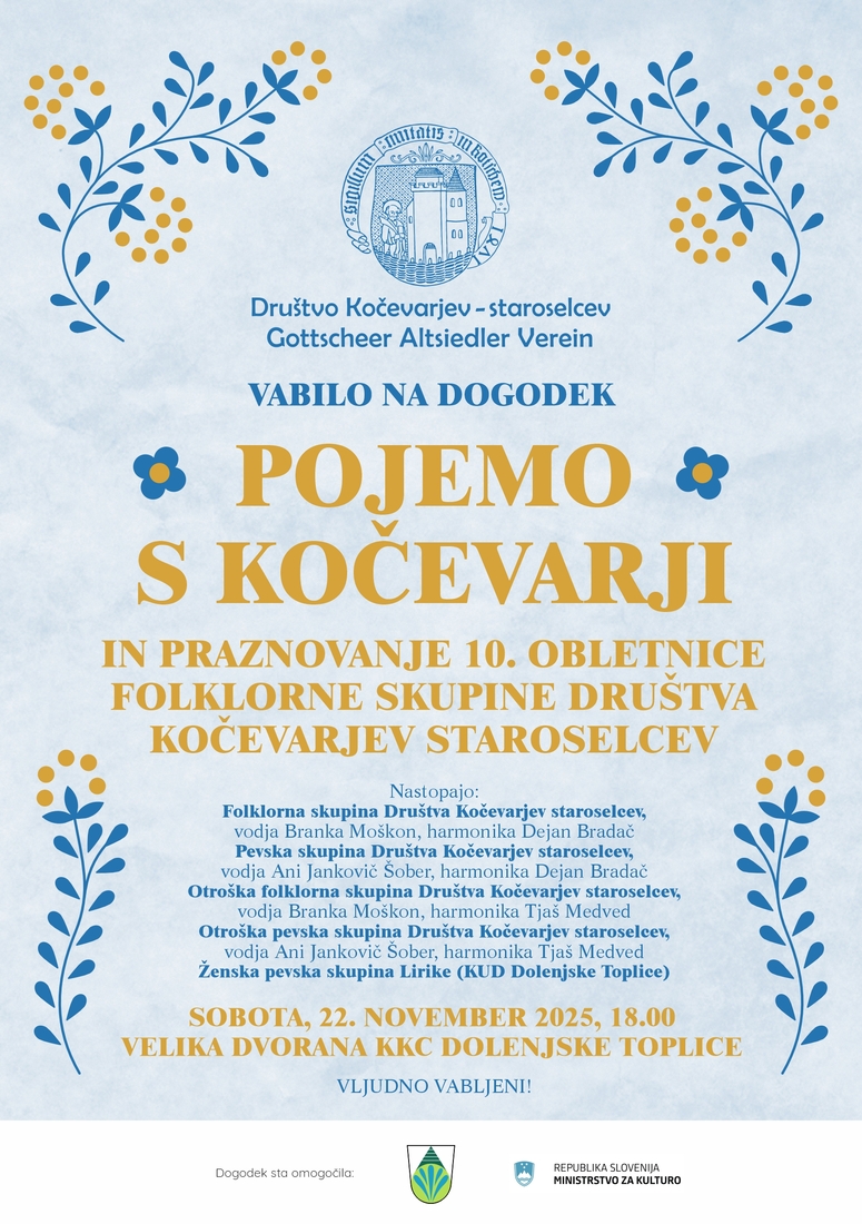 Vljudno vabljeni na nepozaben dogodek "Pojemo s Kočevarji" in praznovanje 10. obletnice folklorne skupine Društva Kočevarjev staroselcev!