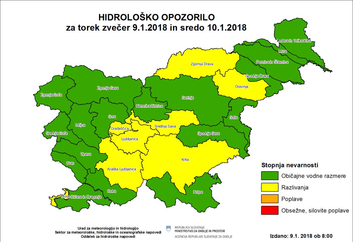 Danes ponoči se lahko ob strugah razlijejo predvsem manjši vodotoki v osrednji Sloveniji, v vzhodnih Karavankah in vodotoki s povirjem na Pohorju in Kozjaku. Zvečer in jutri se bodo povečale kraške ojezeritve in pretoki kraških rek na Notranjskem in Dolenjskem. V sredo se bo Ljubljanica na Barju razlila na območju pogostih poplav.