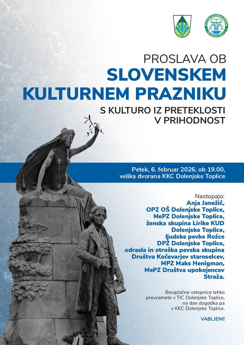 Ob slovenskem kulturnem prazniku vas vljudno vabimo na slavnostno prireditev »S kulturo iz preteklosti v prihodnost«, ki bo potekala v počastitev bogate slovenske kulturne dediščine in njenega pomena za prihodnje rodove.