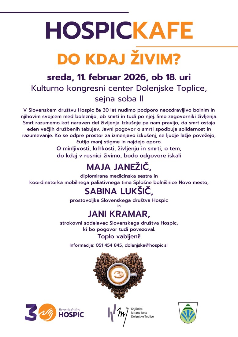 Slovensko društvo Hospic, krajevna knjižnica Dolenjske Toplice in Občina Dolenjske Toplice vabijo na Hospickafe – odprt in spoštljiv pogovor o življenju, minljivosti in smrti.