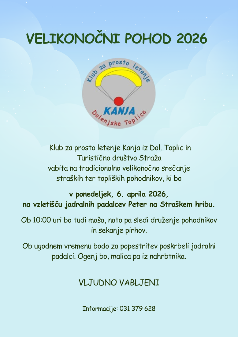 tradicionalno velikonočno srečanje straških ter topliških pohodnikov, ki bo v ponedeljek, 6. aprila 2026, na vzletišču jadralnih padalcev Peter na Straškem hribu.