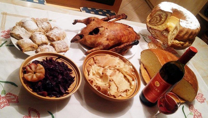 Na mizo je ob prazniku na ta dan sodila tudi posebna hrana, navadno perutnina gos ali raca, nadevana s kostanji ali jabolki, kot priloga pa mlinci in rdeče zelje, kar se je ohranilo vse do danes.