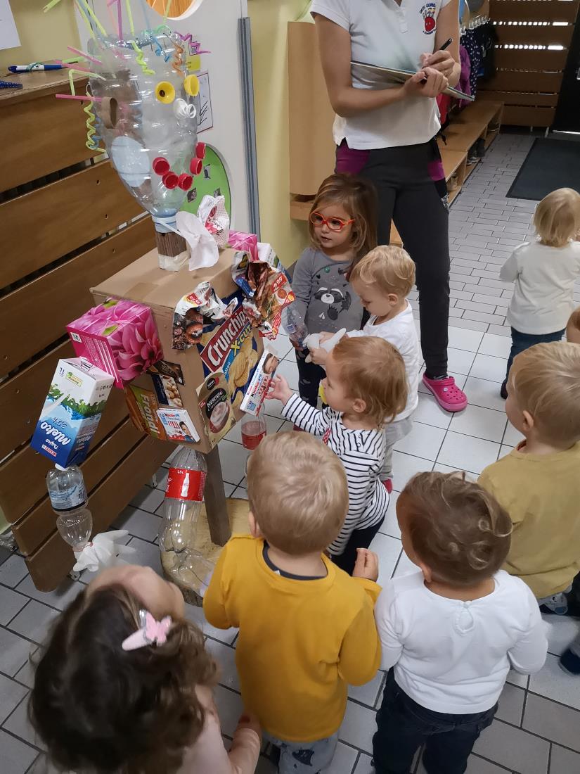 V letošnjem šolskem letu se bomo v vrtcu trudili, da pridobimo zeleno zastavo in naziv Eko vrtec. Da bi otrokom približali odgovornost do narave in okolja ter zdrav način življenja, smo se odločili za prednostno nalogo Eko dežela v vrtcu. Pri načrtovanju presenečenja, ki je bilo v četrtek, 8. 11. 2018, smo izhajali iz eko vsebin. Že pred vrtcem je zjutraj otroke in starše pozdravljal robot (kot so ga sami poimenovali) iz odpadnega materiala, ko pa so odprli vrata vrtca, jih je presenetila zavesa iz plastičnih zamaškov, ki je prebudila še tako zaspane obraze. Pozornost v spodnjem vrtcu je pritegnil vlakec iz kartonskih škatel v barvi zabojnikov za ločevanje odpadkov. Sadje in zelenjava, ki so ju lahko poskusili, pa so jih spomnili na zdravo prehrano. Do zgornjega vrtca so otroci sledili puščicam in fotografijam »eko robota«, kjer so si ogledali še drugi del presenečenja. Ustvarjali so lahko iz odpadnega materiala, razvrščali odpadke ter si ogledali kratek film o odpadkih. Po hodniku je zadišalo po čajih in zeliščih, pričakal pa jih je tudi kotiček z naravnim materialom. Otroci so se presenečenja razveselili, si ga z zanimanjem ogledali, komentirali in povedali svoje vtise. Tekom dopoldneva si je vsaka skupina ponovno ogledala presenečenje, dobili smo kar nekaj zanimivih idej za nadaljnje načrtovanje dejavnosti.