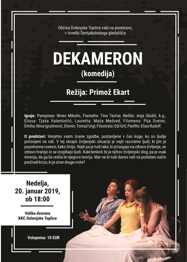 Ob tem nam avtor ponuja še eno možnost. Pripovedujmo si zabavne in šaljive zgodbe, začinjene z lažjo, razvratom in nasiljem, ki mu modreci s spretnim besedičenjem znajo uiti. Zbere se sedem lepih in mladih deklet ter trije postavni možje in si v desetih dneh pripovedujejo vsak dan nove zgodbe v varnem in prijetnem okolju, daleč stran od kužnega ozračja. Pred nami bodo na novo zaživele v dramatizaciji našega člana Janeza Usenika in odrski postavitvi igralca in režiserja Primoža Ekarta, ki ob tej priložnosti s Šentjakobskim gledališčem sodeluje prvič.