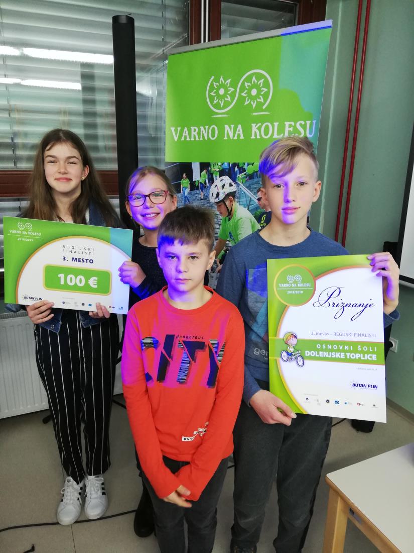 V četrtek, 11. 4. 2019, smo se udeležili zaključnega regijskega srečanja projekta Varno na kolesu, ki je potekalo na Osnovni šoli Bršljin. Na prireditvi so med drugim razglasili zmagovalce. Med šolami na regijskem območju smo dosegli odlično 3. mesto in poleg zahval ter praktičnih daril dobili tudi denarno donacijo v vrednosti 100 eur. Denarno donacijo bomo namenili posodobitvi kolesarske opreme.