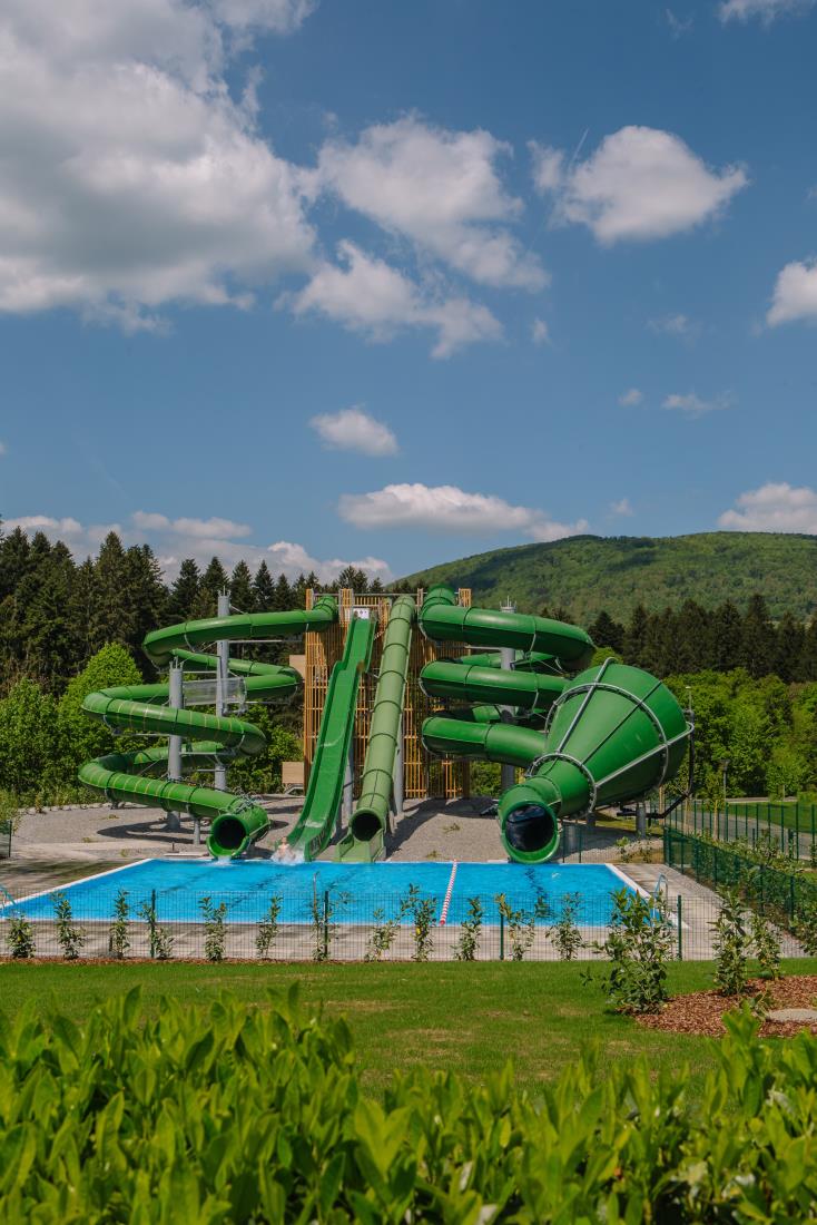 Tobogani in pristajalni bazen so ločeni od glavnega bazena in diskretno umaknjeni v zelenje za kopališko restavracijo. Veseli živžav tako ne bo motil kopalcev ob letnem termalnem bazenu, ki bodo še naprej lahko mirno uživali v kopanju ter lovili sončne žarke na ležalnikih.