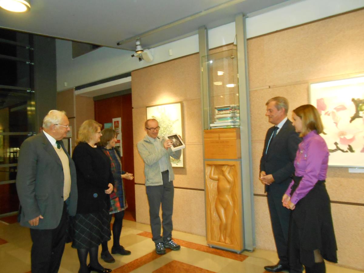 Zbornik Dragotina Gregorca so vstavili v vitrino rastoče knjige: Marko Pršina, dr. Branka Kalenić Ramšak, dr. Janez Gabrijelčič in ravnateljica šole Andreja Koščak.