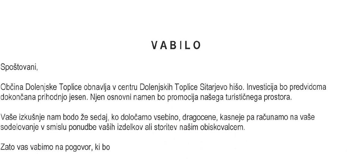 VABILO NA POGOVOR NA OŽIVITEV TURISTIČNEGA IN KULTURNEGA DOGAJANJA V DOLENJSKIH TOPLICAH