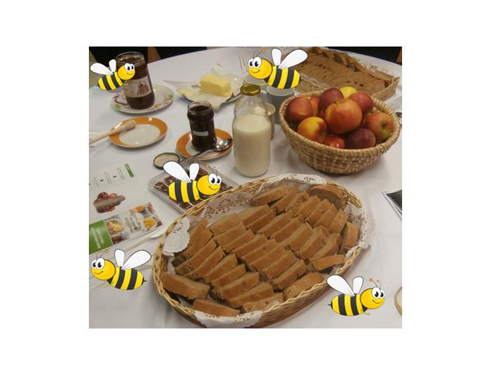 Tradicionalen slovenski zajtrk je sestavljen iz mleka, masla, kruha, medu in jabolk, naj bo letošnji lokalno obarvan. Zato se odpravimo na kmečko tržnico, kjer dobimo med Čebelarstva Šercelj in jabolka Sadjarstva Bučar.