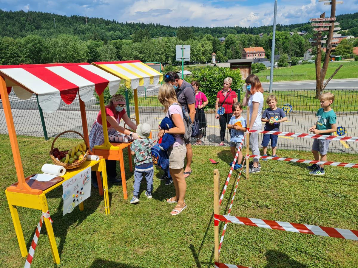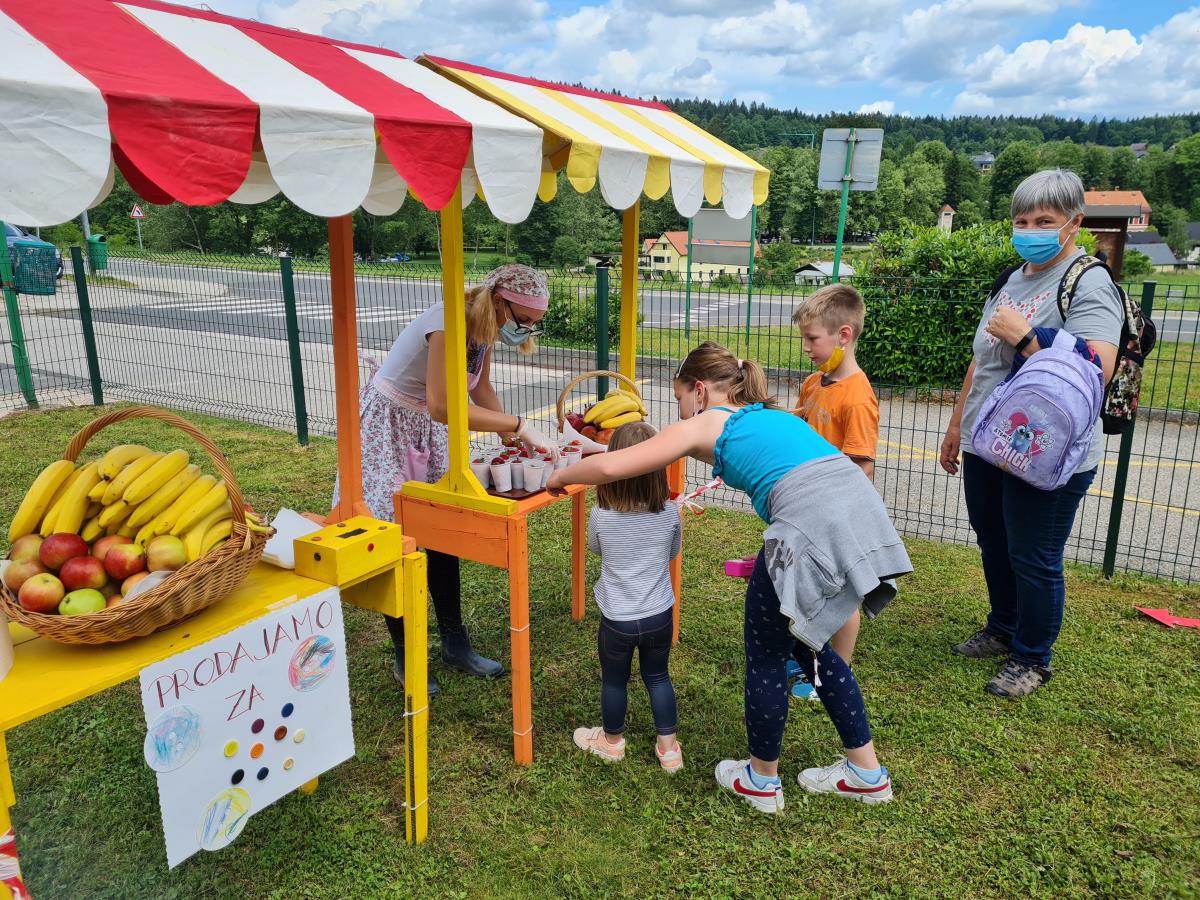 Na ravni celega vrtca smo imeli v petek, 11. 6. 2021, v popoldanskem času srečelov in stojnico s sadjem, ki sta ju vodila junaka zgodbe Prodajamo za gumbe, Ujtata in branjevka. Otroci so pri branjevki z gumbom kupili sadje, pri Ujtataju pa so izžrebali srečko. Z nakupom srečk smo zbirali prostovoljne prispevke, ki jih bomo uporabili za nakup didaktičnih pripomočkov za igro otrok.