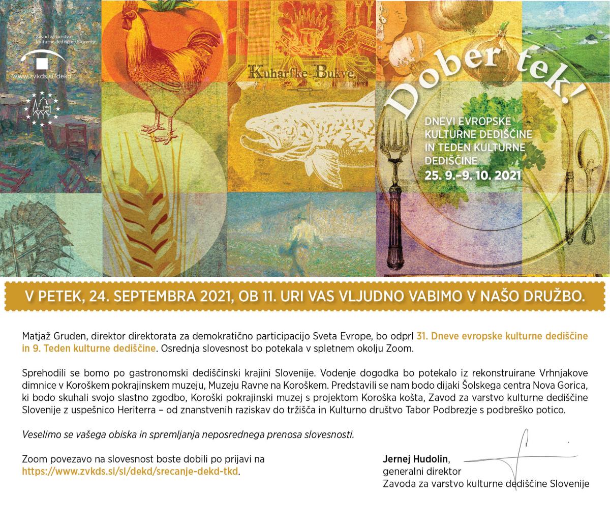 Matjaž Gruden, direktor direktorata za demokratično participacijo Sveta Evrope, bo odprl 31. Dneve evropske kulturne dediščine in 9. Teden kulturne dediščine. Sprehodili se bomo po gastronomski dediščinski krajini Slovenije. Vodenje dogodka bo potekalo iz rekonstruirane Vrhnjakove dimnice v Koroškem pokrajinskem muzeju, Muzeju Ravne na Koroškem. Predstavili se nam bodo dijaki Šolskega centra Nova Gorica, ki bodo skuhali svojo slastno zgodbo, Koroški pokrajinski muzej s projektom Koroška košta, Zavod za varstvo kulturne dediščine Slovenije z uspešnico Heriterra – od znanstvenih raziskav do tržišča in Kulturno društvo Tabor Podbrezje s podbreško potico.