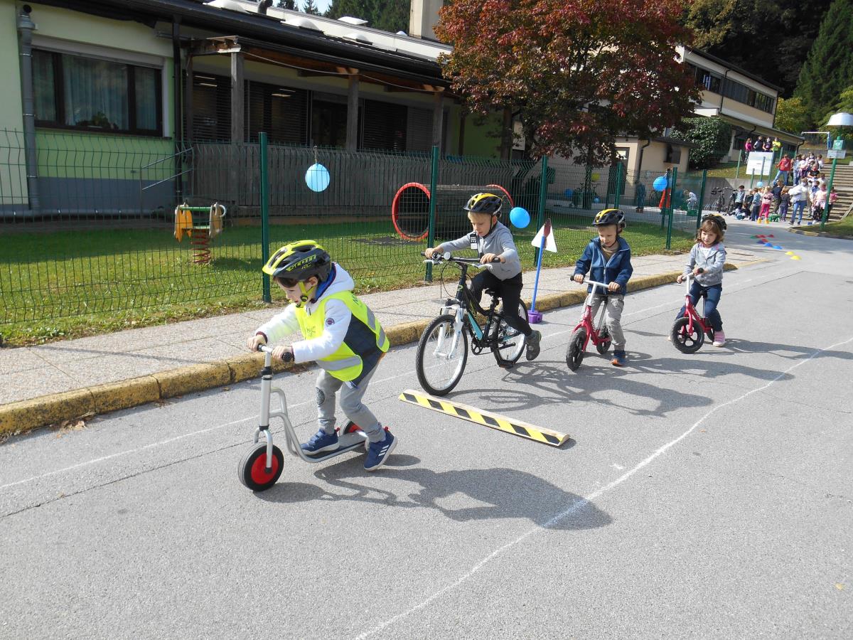 V sredo, 22. 9. 2021, smo izvedli dan brez avtomobila. Ta dan je bilo parkirišče ob vrtcu zaprto, saj so se na njem potekale gibalne dejavnosti za otroke. Otroci so se s poganjalčki in kolesi vozili po prometnem poligonu, risali s kredami, se igrali gibalne in rajalne igre ter svoje gibalne spretnosti preizkušali pri hoji s hoduljami, skokom z mesta ter na gibalnem poligonu. Dogajanje smo popestrili z glasbo, ob kateri smo lahko zaplesali.