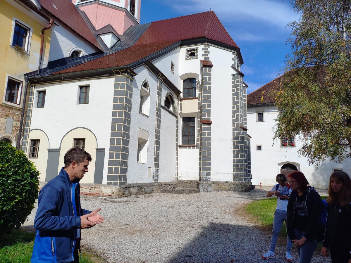 Pot nas je vodila naprej v Stično, kjer smo bili lepo sprejeti v tamkajšnji cistercijanski samostan, v sklopu katerega deluje Muzej krščanstva na Slovenskem. Izvedeli smo, da je bil samostan ustanovljen v začetku 12. stoletja in da je več stoletij veljal za vsestransko središče takratne dežele Kranjske. Ogledali smo si nekatere notranje prostore samostana, navdušila sta nas zlasti znameniti križni hodnik in jedilnica, ki je bila pravo presenečenje za naše oči – njen strop je namreč obokan in prezicno poslikan, pohištvo pa bogato iztesano. Kustos nam je povedal, da menihi med obedovanjem sedijo vsak zase in se ne pogovarjajo, pri tem pa poslušajo branje Svetega pisma. Ogledali smo si tudi redovno cerkev, ki velja za eno najstarejših in največjih cerkva na Slovenskem. Nadaljevali smo z ogledom muzejske zbirke, podrobneje smo se seznanili z bogato pisno dediščino srednjeveških rokopisov, zlasti s Stiškim rokopisom iz leta 1428, ki sodi med najstarejše zapise v slovenskem jeziku. Obisk smo zaključili z aktivnim sodelovanjem v delavnici, kjer so učenci postali pisarski mojstri, kot je bil mnogo stoletij poprej mojster Bernard. Prejeli so kaligrafska peresa, črnilo, papir in se preizkusili v protogotici – pisavi stiških romanskih rokopisov.