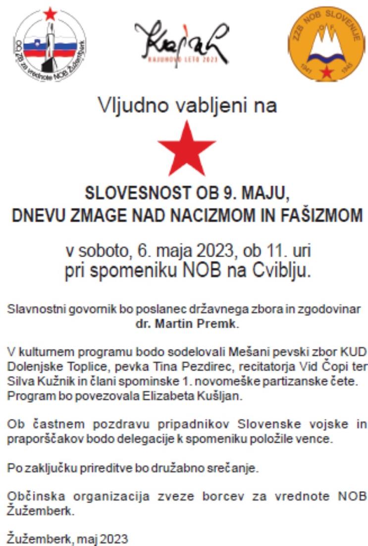 Občinska organizacija Zveze borcev za vrednote NOB Žužemberk vabi na slovensnost ob 9. maju, dnevu zmage nad fašizmom in nacizmom, ki bo v soboto, 6. maja 2023, ob 11.00 pri spomeniku NOB na Cviblju. Slavnostni govornik bo poslanec državnega zbora in zgodovinar dr. Martin Premk. V kulturnem programu bodo sodelovaIi Mešani pevski zbor KUD olenjske Toplice, pevka Tina Pezdirec, recitatorja Vid Čopi ter Silva Kužnik in člani spominske 1. novomeške partizanske čete. Program bo povezovala Elizabeta Kušljan. Ob častnem pozdravu pripadnikov Slovenske vojske in praporščakov bodo delegacije k spomeniku položile vence, po zaključku pa sledi še družabno srečanje.