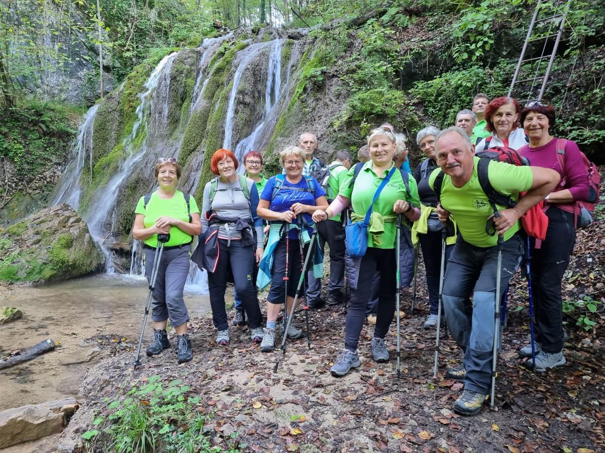 Že jutro in dobra volja udeležencev, sta nakazovala , da bomo preživeli en lep , jesenski dan. Pridružili so se nam tudi prijatelji, Mateja Teropšič, ki še ni v upokojenskih vrstah, s svojo mladostno energijo. Lahko rečemo, da je bilo to tudi medgeneracijsko srečanje. S pohodom smo začeli in končali pri cerkvi Sv. Tilna v Višnji gori. Do Dednega dola smo hodili po asfaltirani cesti. Že v vasi smo začeli hoditi ob strugi potoka Višnjica, ki se polagoma čedalje bolj širi in jo ob koncu vasi objame gozd. Po slabi uri hoje ob potoku, čez brvi nas kažipota ob prvem slapu Višnjica usmerita na dve poti. Težja po lestvi, lažja okoli, ki se kasneje združita. Šumenje vode z oddaljevanjem od njegovega izvira polagoma potihne in se po širši gozdni cesti vzpnemo proti prvemu vrhu na poti Kuclju, ki je s 748 metri najvišja točka pohoda in se nahaja v občini Grosuplje, sicer hodimo po občini Ivančna Gorica. Na prostrani planoti je geodetski stolp, križ in klopca ljubezni, ki ponuja pogled na Triglav z Julijci in na druge vrhove Karavank in Kamniško-Savinjskih Alp na severozahodu, proti jugozahodu pa seže do Snežnika. Bliže objame vasi pod hribom. Sledil je spust do vasi Gornje Brezovo in bližnjo Kavbojsko deželo ČOŽ. V Kavbojski deželi prav vsak izmed obiskovalcev najde kaj zanimivega zase. Medtem, ko se bodo otroci igrali, se bodo lahko starši družili ob pikniku, se podali na sprehod, uživali v prijetnem lokalu itd. Prijazen sprejem, odlična gostinska ponudba, čudovite stvaritve v lesu, veliko zanimivega, od igral, glampinga, živali ..v prelepi zeleni dolini. Vse to in še več, nas je prepričalo, da se vrnemo in navdušimo otroke, vnuke, prijatelje. Pot smo nadaljevali na razgledno Gradišče, kjer stoji križ, informativna tabla, saj je bilo tu prazgodovinsko gradišče, kjer so kopali in talili železovo rudo. Od vasi Vrh, po prijetni gozdni poti smo ob izviru potoka Košce. Tukaj je svet povsem drugačen kot ob potoku Višnjica – kamenje in skale so debelo obrasli z mahom, rastje je bujno. Ozka pot, ki se strmo spušča, ob jeklenici , vodi do drugega 20 m slapa Košce, ki je tudi najvišji lehnjakov slap v Sloveniji.