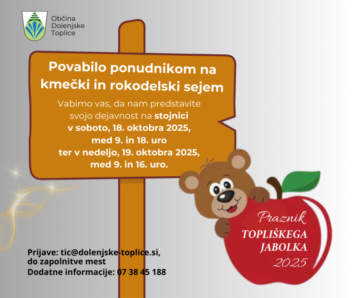 Občina Dolenjske Toplice vabi vse zainteresirane ponudnike k sodelovanju na kmečkem in rokodelskem sejmu, ki bo potekal v okviru osrednje jesenske prireditve v občini – Topliško jabolko 2025.